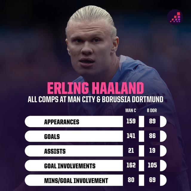 哈兰德在曼城和多特蒙德都保持非常高的进球效率。据数据机构Opta统计,哈兰德总共为多特蒙德出场89次,打进86球,还送出19次助攻,直接参与105球,每69分钟造一球。